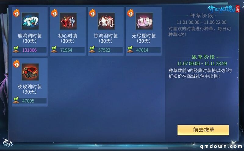 今年的双11,倩女手游希望玩家既能玩得欢畅,更能买得尽兴。上周五晚,双11【全民种草】玩法正式进入拔草阶段,5套人气最高的经典时装限时返场并在灵玉商城折扣出售。同步上架出售的还有多款物美价廉的双11节日限时礼包,内含各种游戏珍稀道具及丰厚积分奖励,双11期间只需用超低价格即可购入。豪华礼花券、一掌风月宝鉴、碧柳露……各种精美节日礼包内道具令人目不暇接,快去游戏中剁手买买买吧!